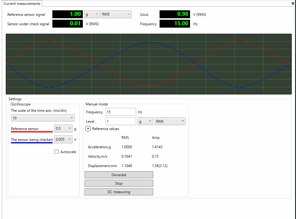 علاوه بر اندازهگیریهای خودکار، یک حالت اندازهگیری دستی در نرم افزار پیادهسازی میشود. این حالت امکان تعیین فرکانس و دامنه (در واحدهای شتاب، سرعت یا جابجایی) را به صورت دستی و بررسی پاسخ سنسورها فراهم می کند. این حالت برای اهداف تحقیقاتی بسیار مفید است.