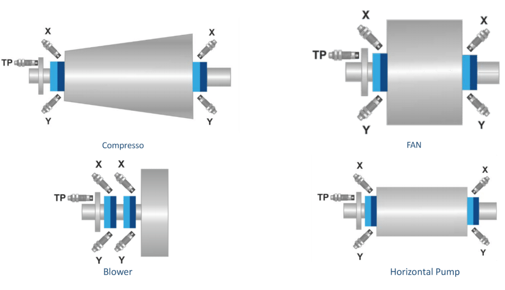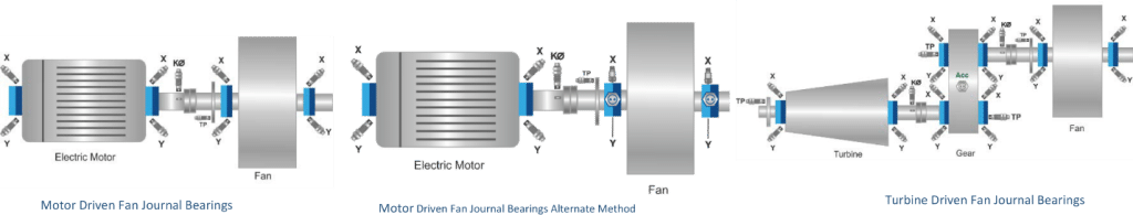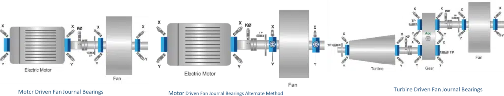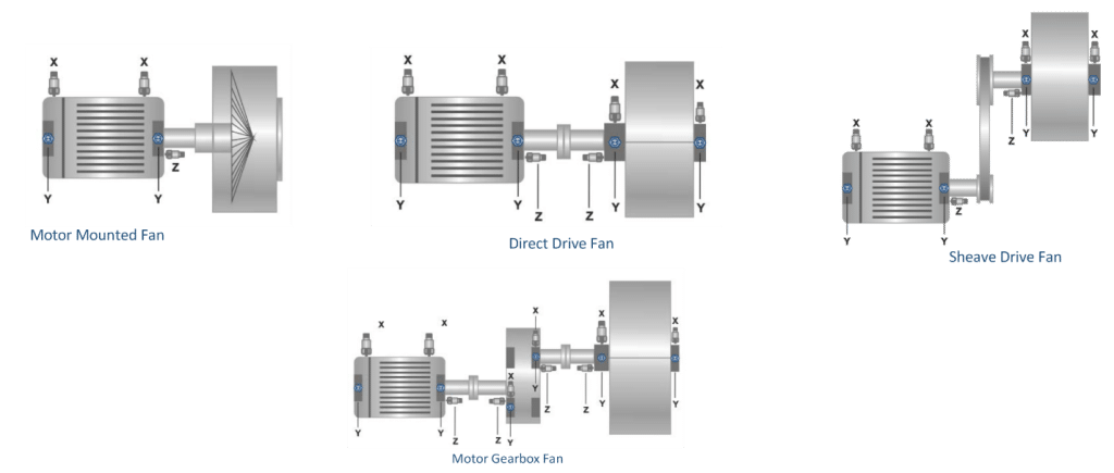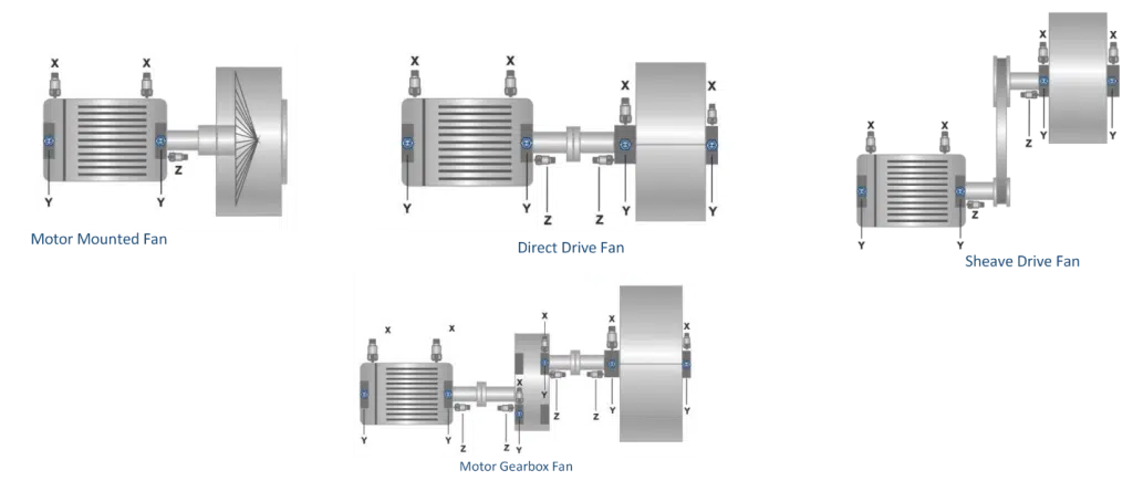 فن ها و دمنده های صنعتی در ساختار های مختلفی استفاده می شوند که در اشکال زیر نشان داده شده است. در این ماشین ها، نظارت بر ارتعاشات بر روی بیرینگ های غلتشی متمرکز می شود. نقش فن یا دمنده در تولید می تواند بر تعداد سنسورهای نصب شده تأثیر بگذارد. عمدتاً اولین سنسور در انتهای محرک دستگاه نصب می شود. اگر سرعت فن یا دمنده زیر ۶۰۰ دور در دقیقه است، پیشنهاد می گردد فرکانس پایین را برای سنسورها و مانیتورها انتخاب کنید.
