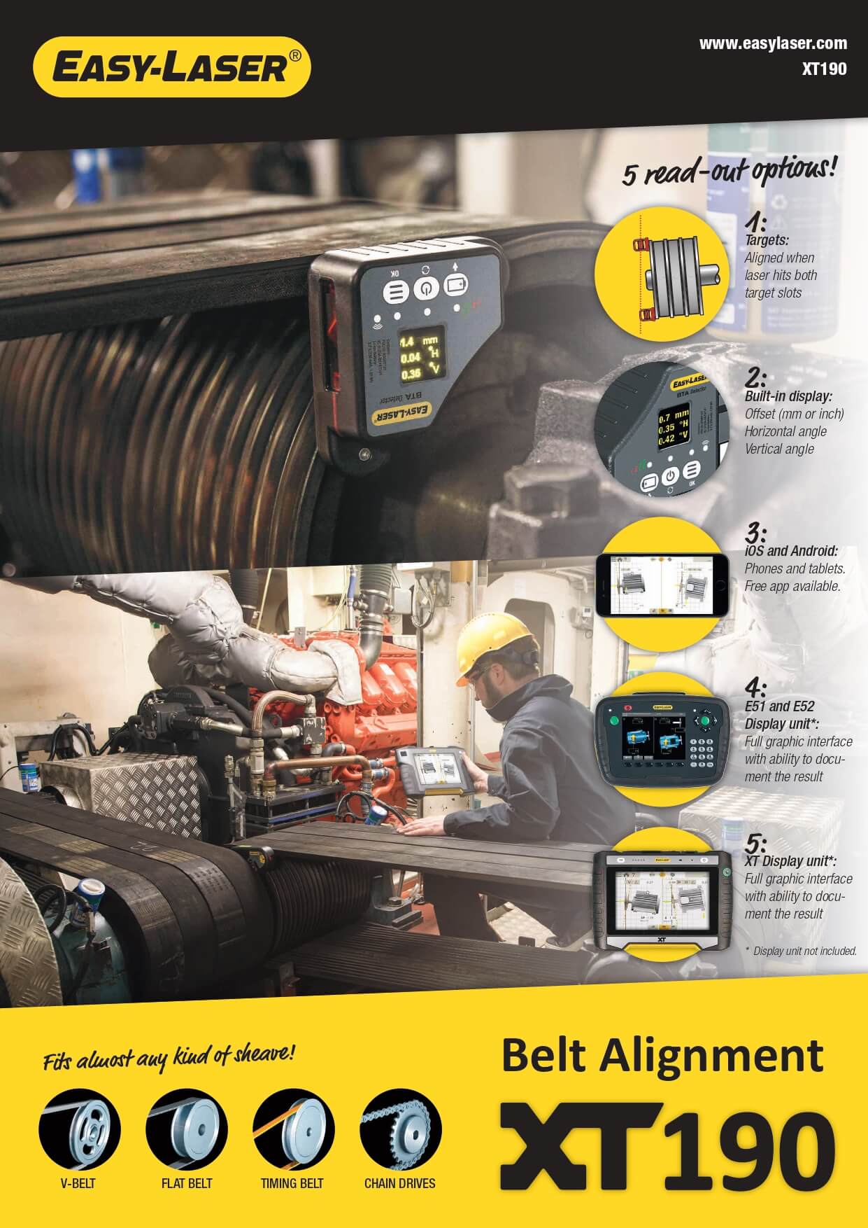 واحدهای نمایش E51 و E52 برای سیستمهای شفت و ژئو سری E شامل برنامه تراز کردن پولی هستند. با اضافه کردن XT190 میتوانید تراز تسمهها را نیز مستندسازی کنید.