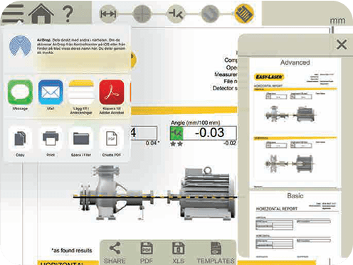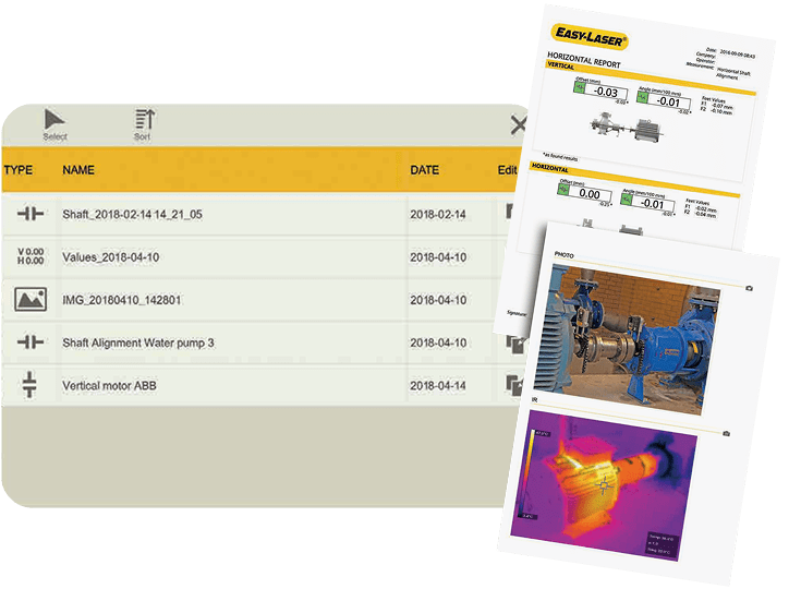 از طریق اپلیکیشن، میتوانید بهراحتی یک گزارش PDF شامل تمامی دادههای اندازهگیری و تصاویر تهیه و به اشتراک بگذارید. اگر از نمایشگر XT استفاده میکنید، این دستگاه دارای دوربین داخلی ۱۳ مگاپیکسلی است. همچنین امکان افزودن دوربین حرارتی (IR) به این نمایشگر وجود دارد تا بتوانید تصویر حرارتی دستگاه را قبل و بعد از همراستاسازی ثبت و مستند کنید.