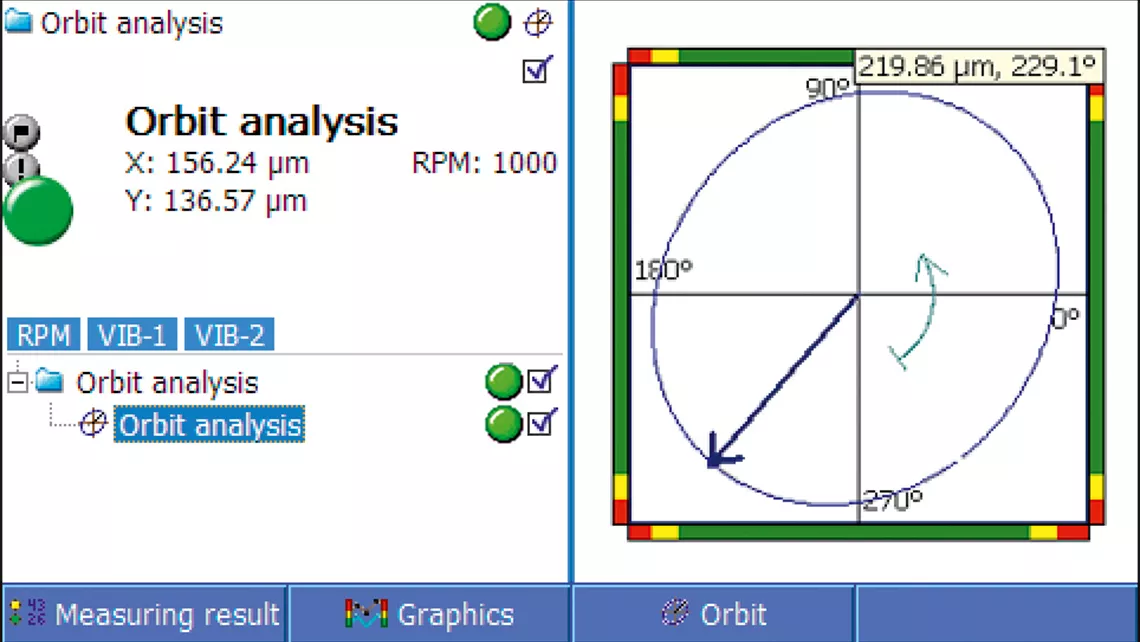 در تمام ماشینآلات مجهز به بیرینگهای ژورنال، اندازهگیری همزمان با استفاده از دو سنسور ارتعاش، یک نمودار دقیق از حرکت مرکز محور ارائه میدهد.