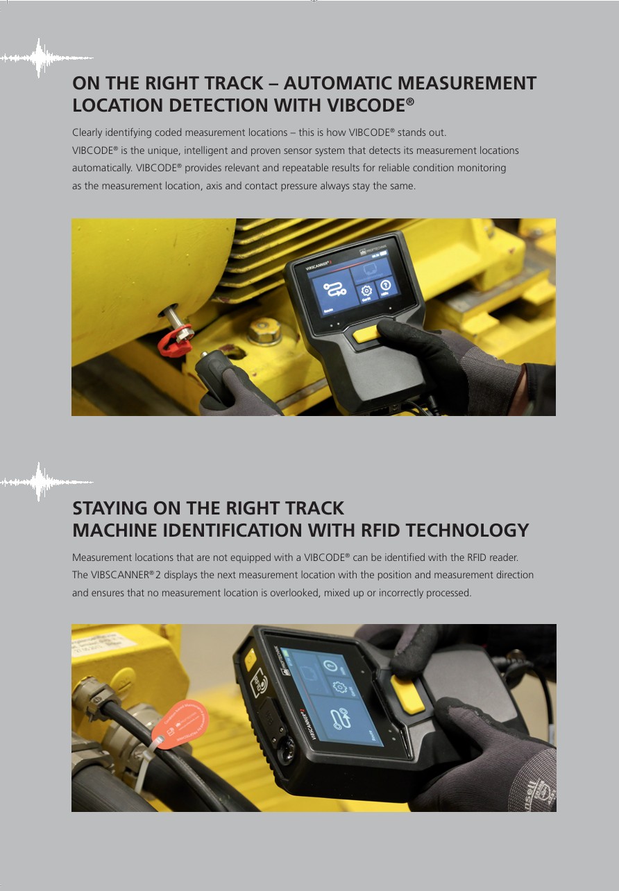 سنسور تریاکسیال امکان شناسایی شرایط پیچیدهای مانند بلبرینگ کج یا شفت خمیده را در یک اندازهگیری واحد فراهم میکند، در حالی که سنسورهای تکمحوره برای ثبت چنین دادههایی به چندین اندازهگیری نیاز دارند. علاوه بر این، VIBSCANNER® 2 با سیستمهای VIBCODE® و RFID، مکانهای اندازهگیری را به صورت خودکار و دقیق شناسایی میکند و اطمینان حاصل میکند که هیچ محل اندازهگیری فراموش، اشتباه یا جابجا ثبت نمیشود.