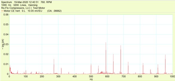 این مقاله در درجه اول به داده های ارتعاشات ارائه شده در نمودارهای FFT اشاره می کند. نمودار FFT دامنه ارتعاش در مقابل فرکانس را نشان می دهد. نمودار طیف نشان می دهد که ارتعاش در چه فرکانس هایی رخ می دهد، یعنی کمپرسور در چه فرکانس هایی ارتعاش می کند. علت ارتعاشات کمپرسور دارای فرکانس های خاصی هستند که به آنها اجازه می دهد با نمودار FFT شناسایی شوند. نمودار FFT زیر ارتعاشات یک موتور الکتریکی با خرابی بلبرینگ را نشان می دهد.