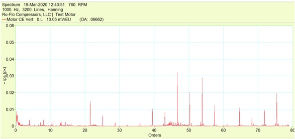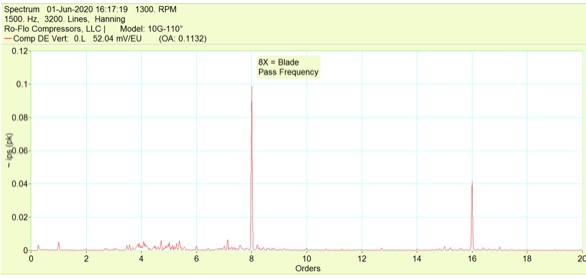 یکی دیگر از راههای آسان برای نمایش فرکانس در نمودار FFT، فرکانس ارتعاش تقسیم بر فرکانس سرعت کار کمپرسور است. به عنوان مثال، اگر دامنه ارتعاش در 60 هرتز رخ دهد و سرعت کمپرسور 3600 دور در دقیقه (60 هرتز) باشد، ترتیبی که دامنه ارتعاش در آن رخ می دهد 1X سرعت عملیاتی است. بسیاری از ارتعاشات کمپرسور در فرکانسهایی رخ میدهد که به طور مستقیم با سرعت عملکرد کمپرسور متناسب است، بنابراین نمایش فرکانس به ترتیب در نمودارهای FFT میتواند بسیار سودمند باشد. نمودار زیر همان داده های ارتعاشی خرابی بلبرینگ موتور الکتریکی را نشان می دهد.