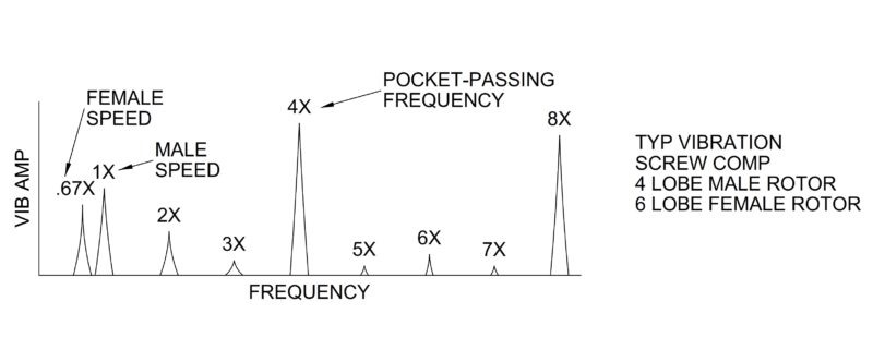 اگر روتور نر کمپرسور پیچ دارای تعداد لوب های متفاوتی نسبت به روتور مادگی باشد، سرعت چرخش متفاوتی خواهند داشت. می توان انتظار داشت که لرزش در 1 برابر سرعت روتور نر و 1 برابر سرعت روتور مادگی رخ دهد. با استفاده از روتور نر چهار لوب / روتور ماده شش لوب، سرعت روتور مادگی 4/6 = 0.67 برابر سرعت روتور نر خواهد بود.