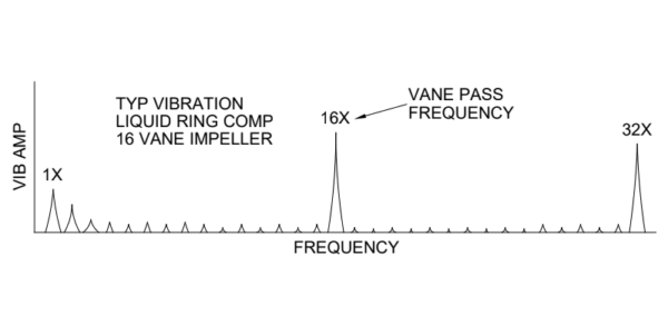 همانطور که در مورد کمپرسورهای جابجایی مثبت انتظار می رود، کمپرسور رینگ مایع، ضربان فشار ایجاد می کند. این ضربانهای فشاری باعث ایجاد ارتعاش کمپرسور در فرکانس برابر سرعت کار ضربدر تعداد پرههای روی پروانه میشوند. این فرکانس به فرکانس عبور پره معروف است. دامنههای ارتعاشی که در چند برابر فرکانس عبور پره رخ میدهند نیز قابل انتظار است. کاویتاسیون یک نگرانی مکرر در کمپرسورهای رینگ مایع است. اگر کاویتاسیون رخ دهد، معمولاً باعث افزایش ارتعاش در فرکانس عبور پره و چند برابر این فرکانس می شود.کمپرسورهای رینگ مایع می توانند لرزش کمتری نسبت به انواع دیگر کمپرسورها داشته باشند. رینگ مایع داخل کمپرسور می تواند ضربان های فشار را کاهش دهد که به پایین نگه داشتن سطح ارتعاش کمک می کند.